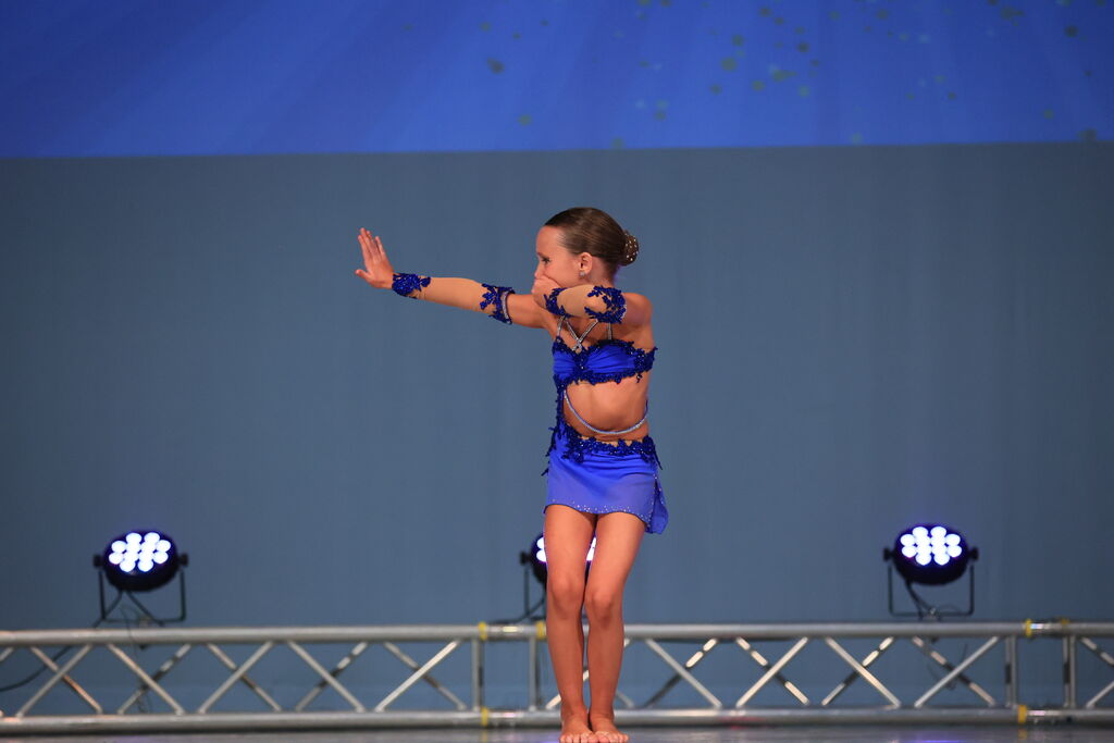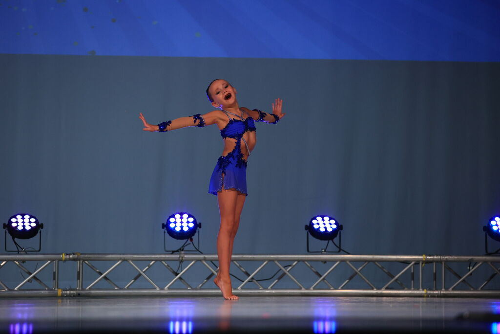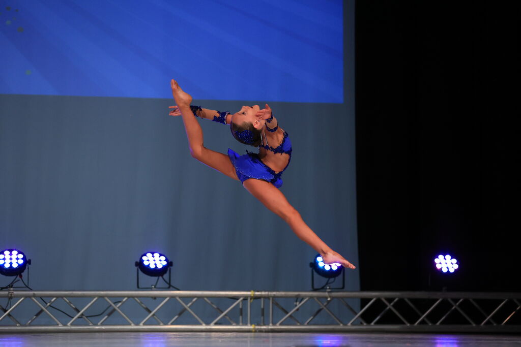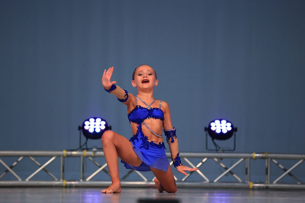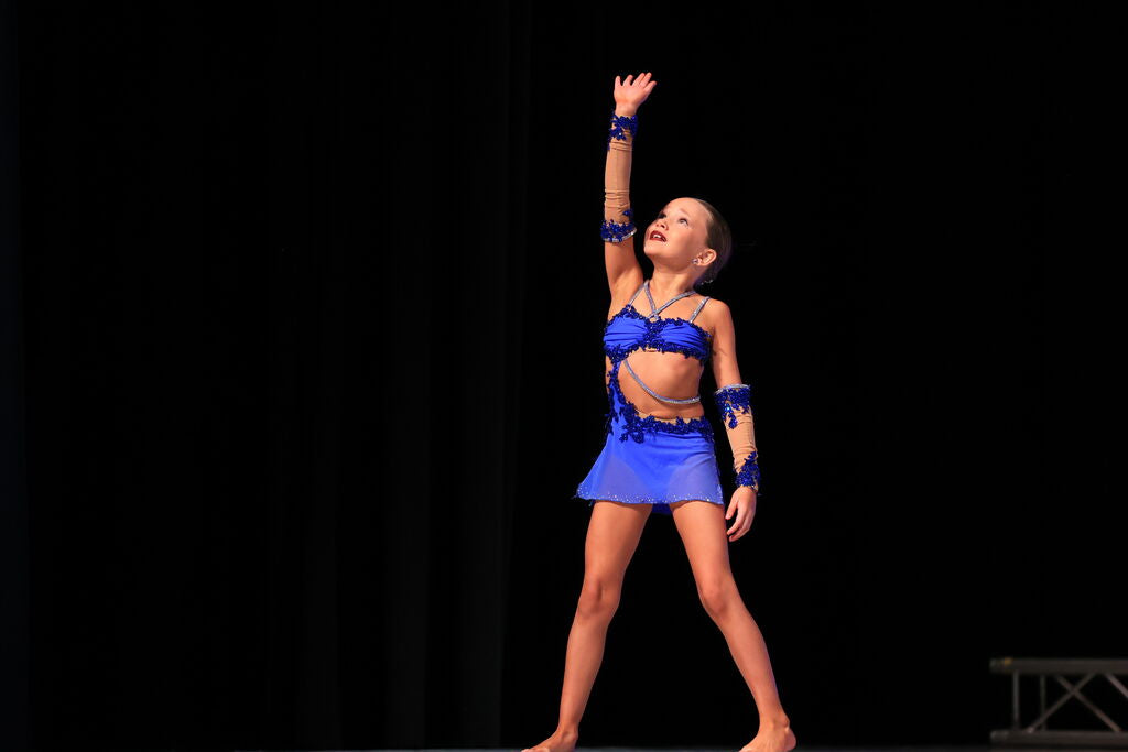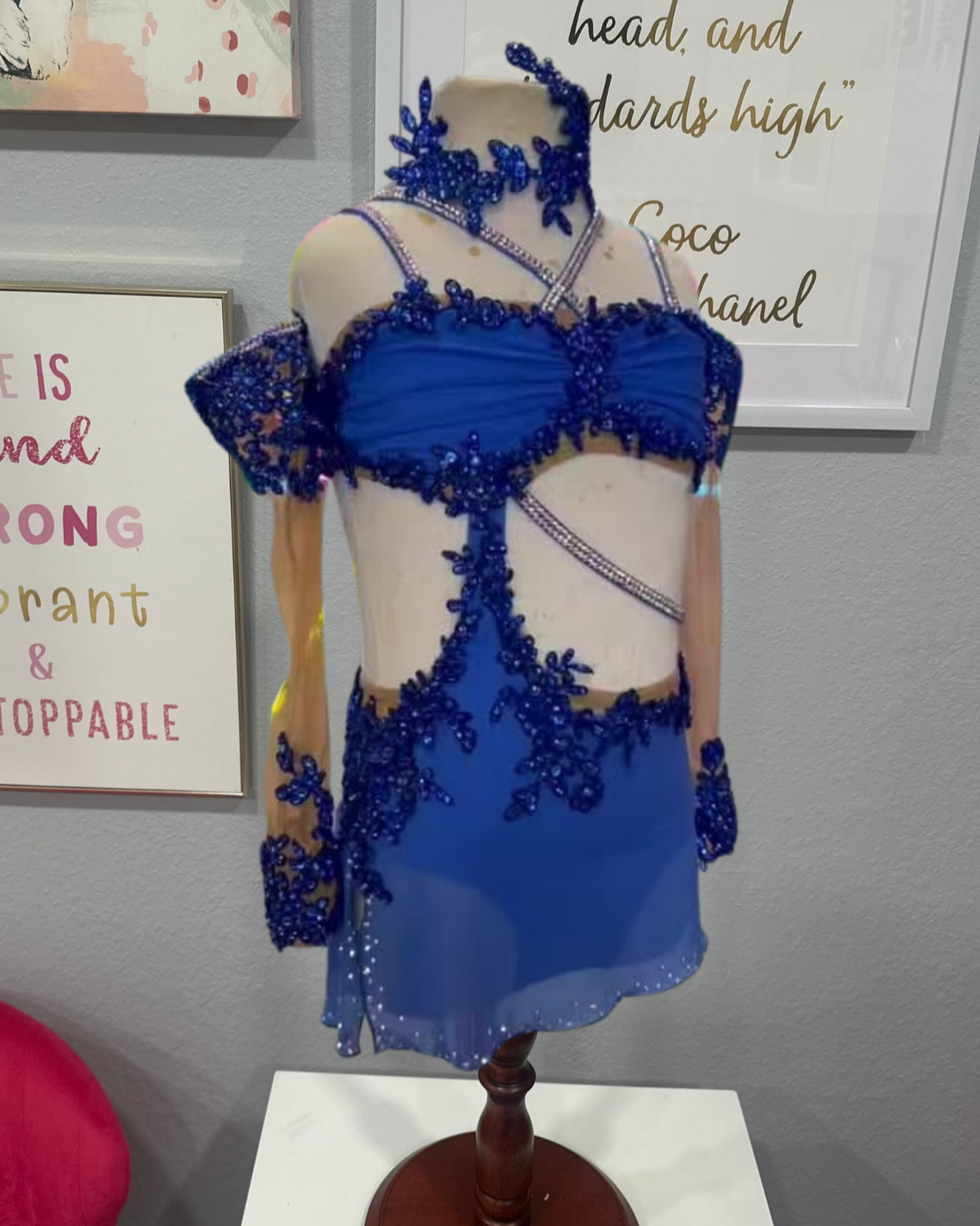 The most stunning lyrical costume ever. The most stunning deep royal blue color covered with applique and Swarovski blue stones. The entire bottom glistens with AB stones and mesh removable sleeves that are adorned with delicate applique. A beautiful blue headpiece and fully stoned straps throughout. Truly one of a kind and a shop stopper.