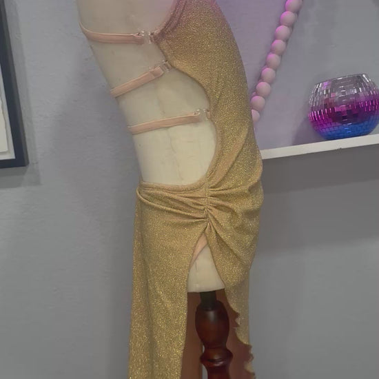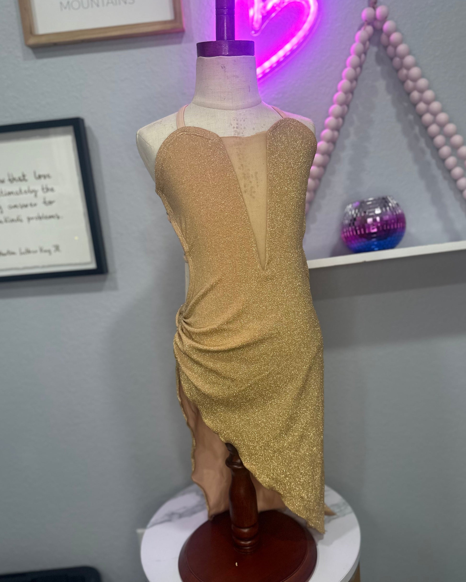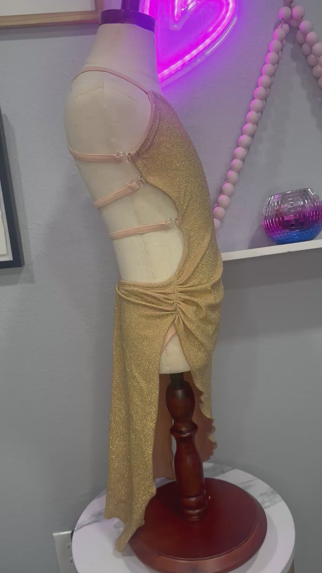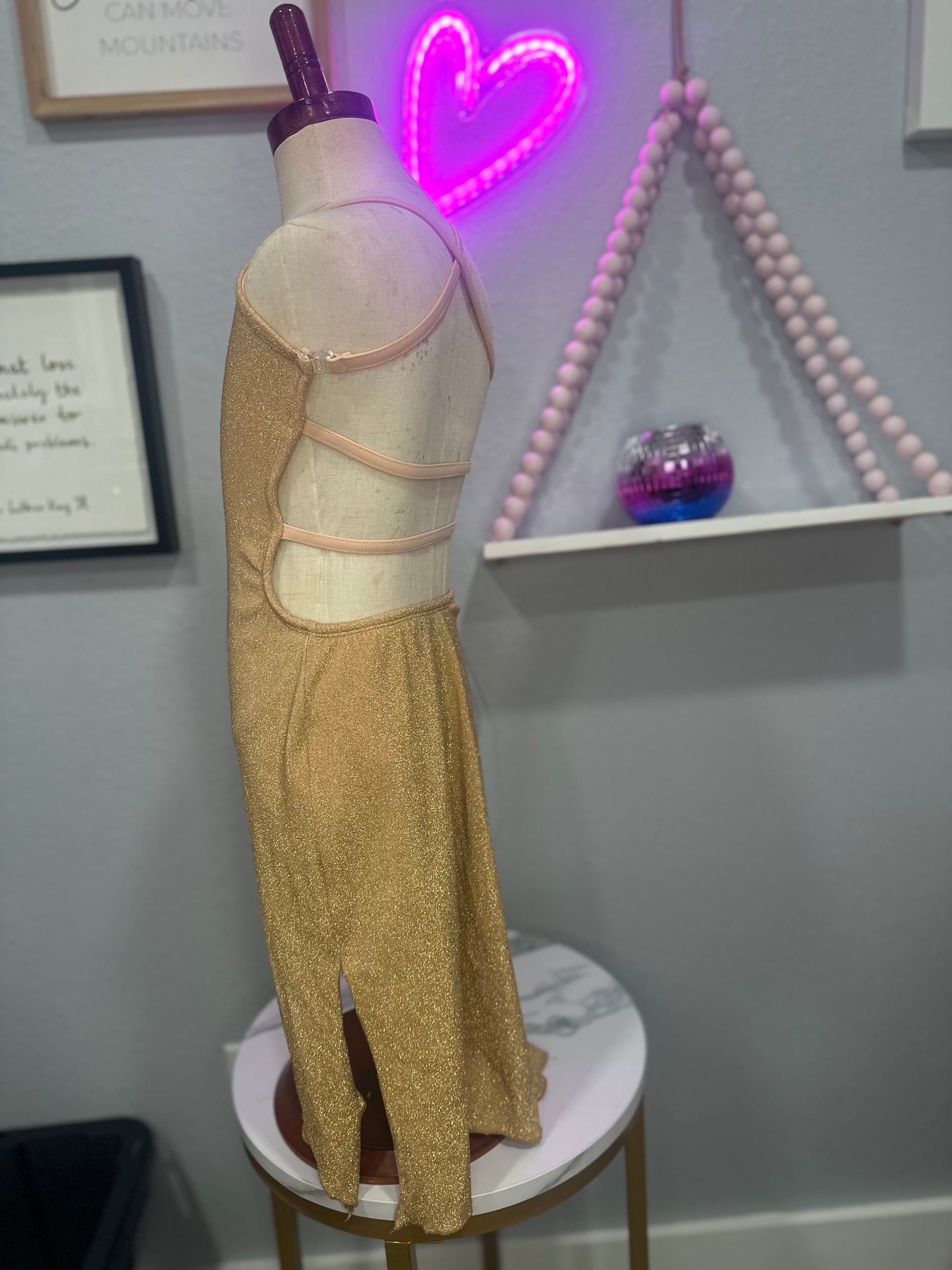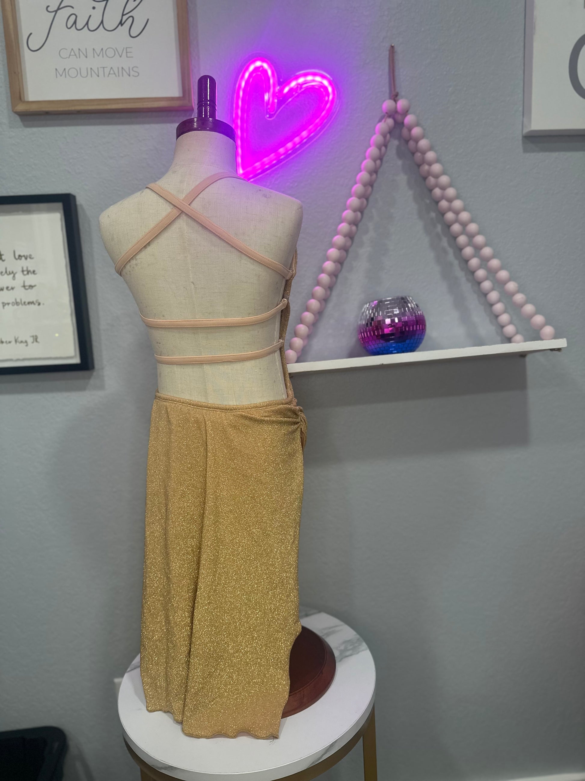 Designed and created by the extremely talented Bahar from 2Die4 Costumes, this costume is both simple and sophisticated. Featuring a sparkling gold fabric, it offers a sleek, elegant silhouette that is perfect for contemporary or lyrical routines.