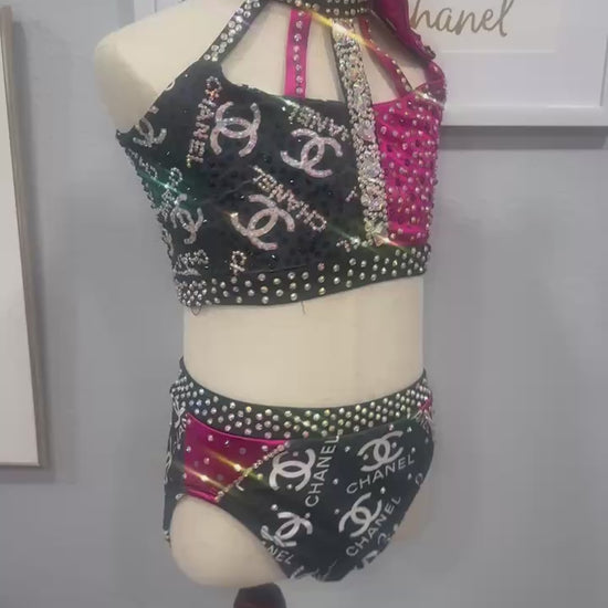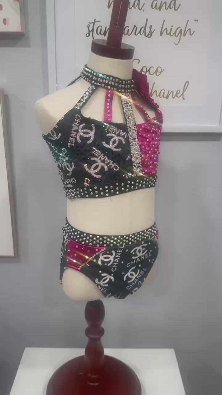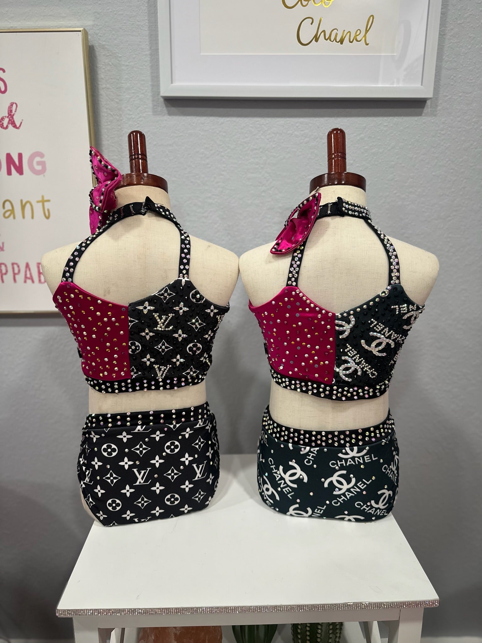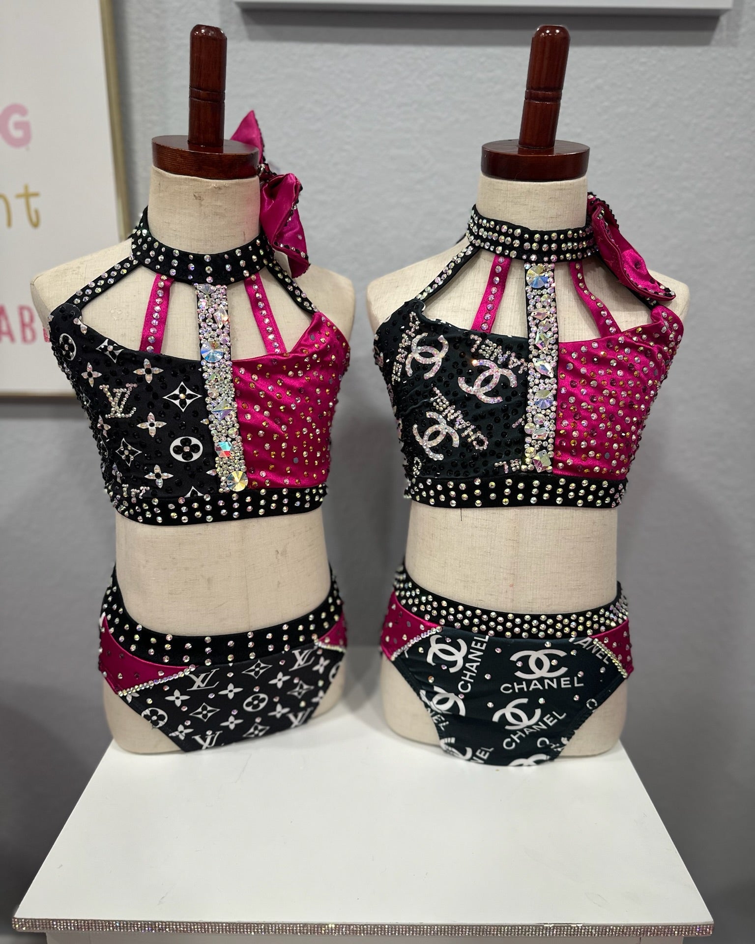 Make a statement in this eye-catching hot pink and black duo set, crafted from designer-inspired fabric and fully custom-made for the stage. Covered in premium stones that shimmer with every move, each costume includes a removable bolero and a matching bow for that extra pop of flair. Bold, brilliant, and built to shine—this duo is perfect for a dynamic performance with attitude and elegance.
