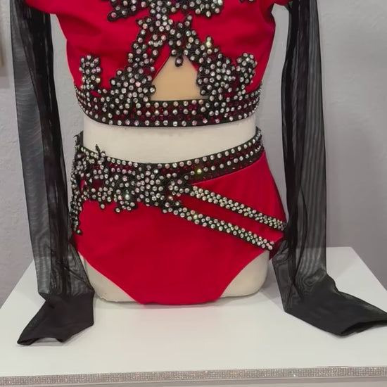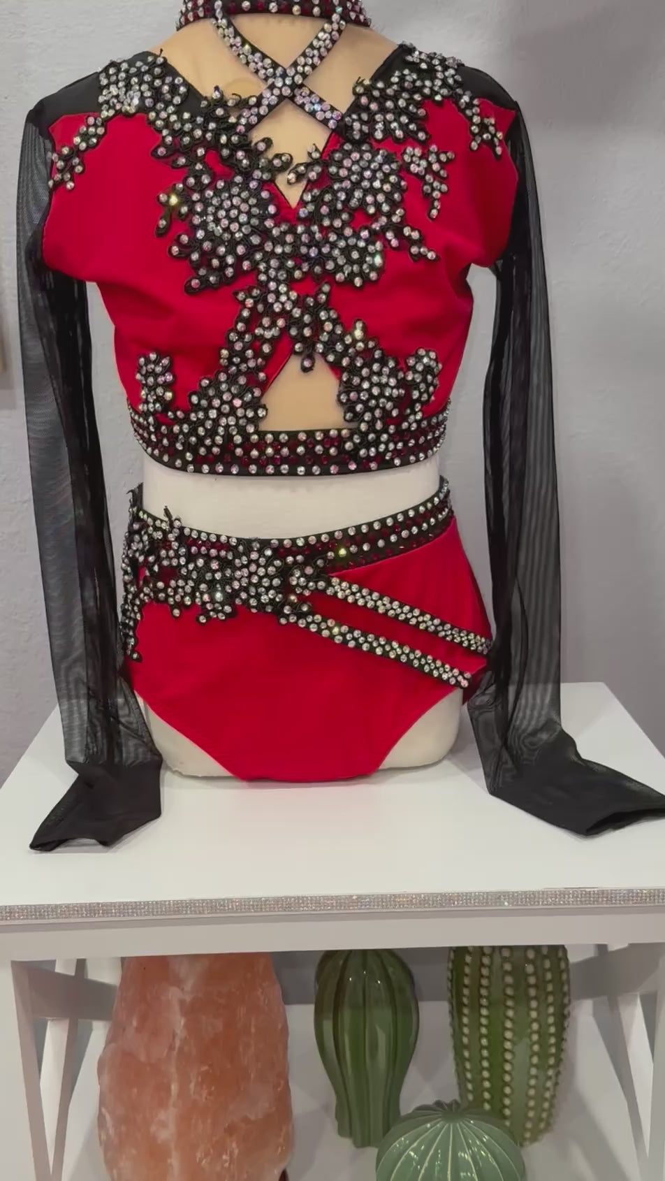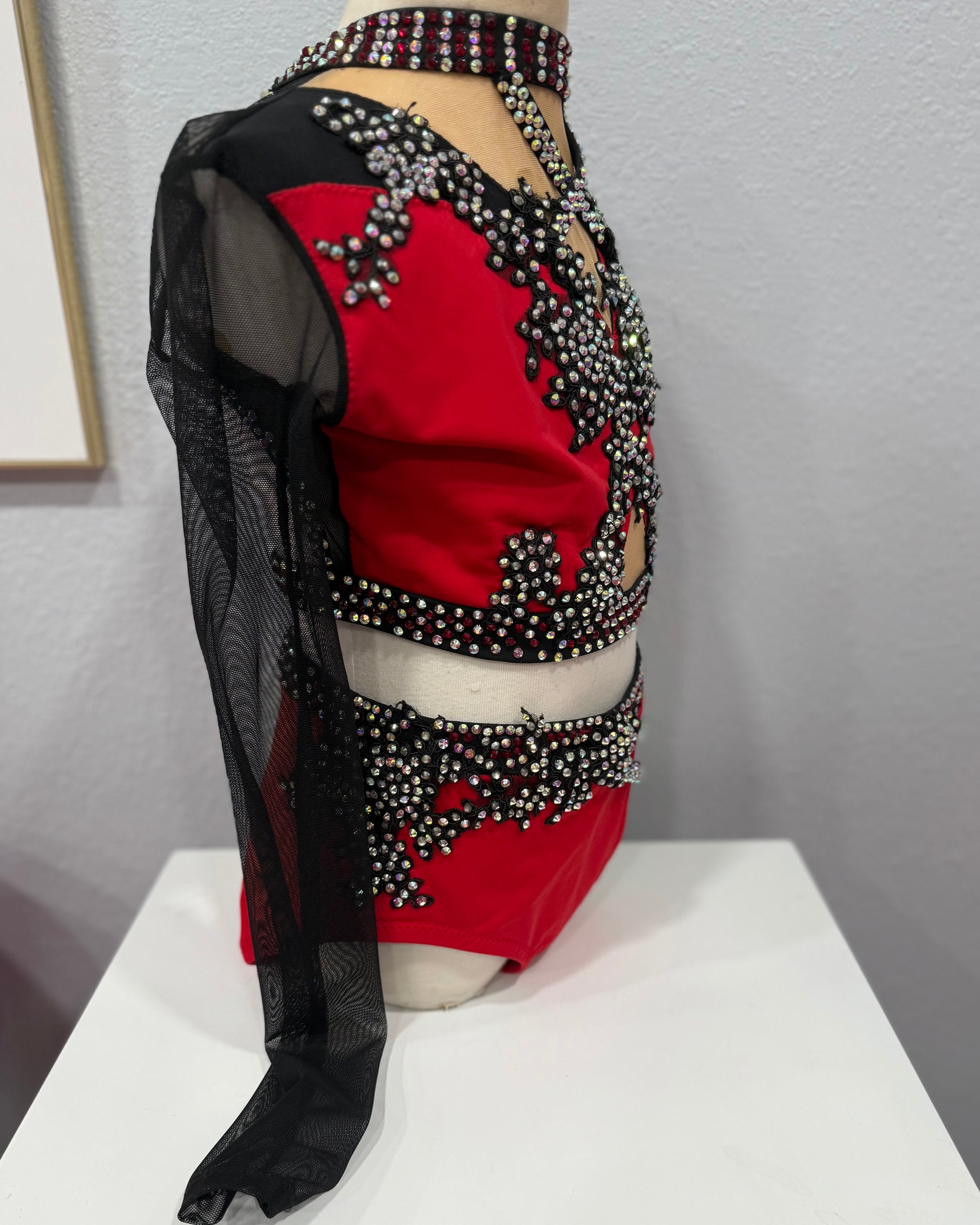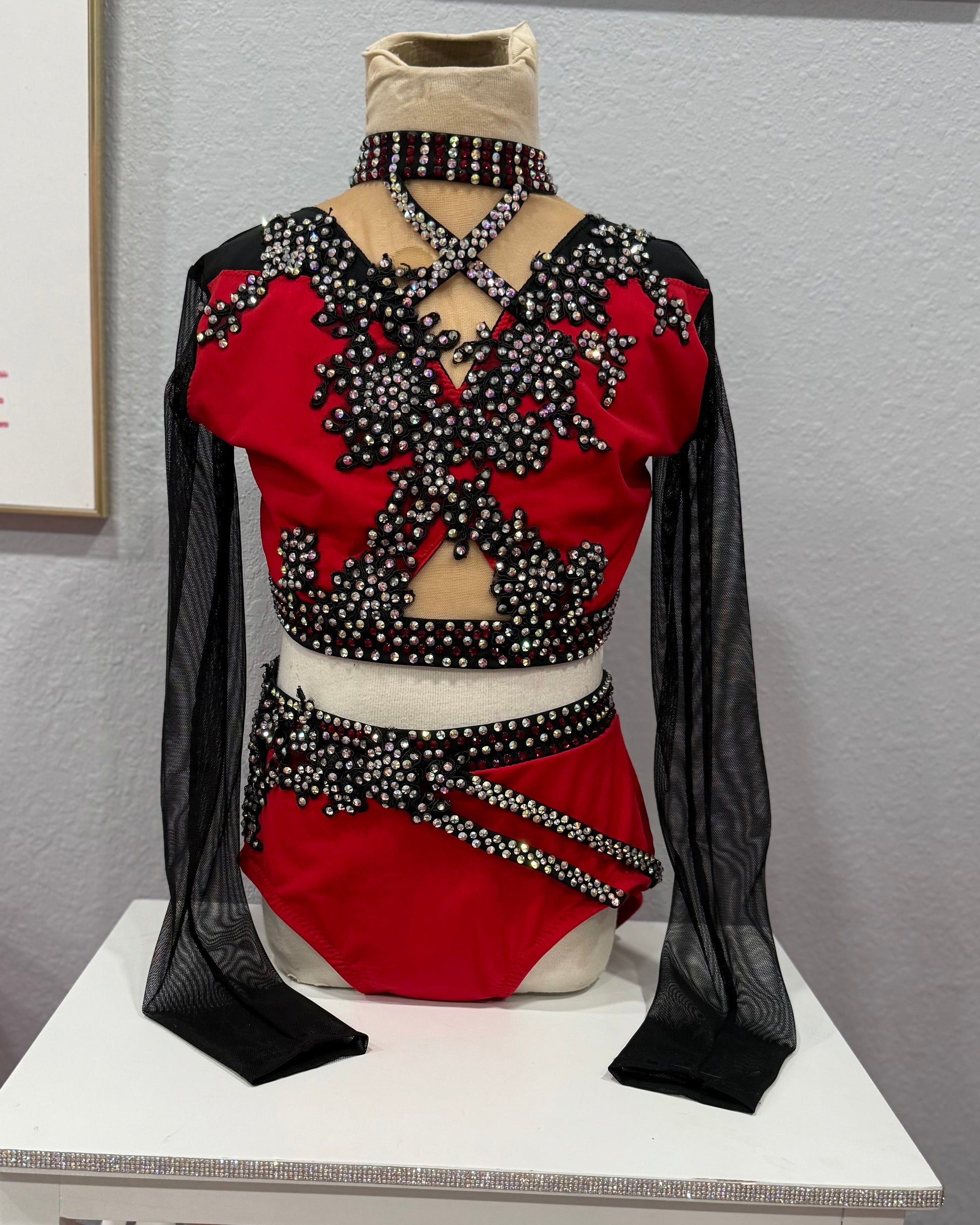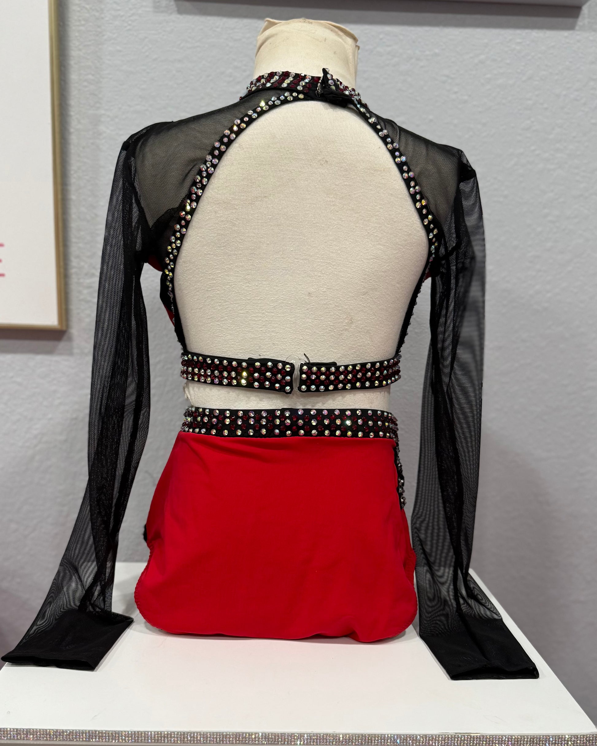 This striking red and black costume is a showstopper, featuring intricate rhinestone embellishments that catch the light from every angle. With dramatic mesh sleeves, bold cutouts, and luxe detailing, it’s designed to command attention and elevate any performance.