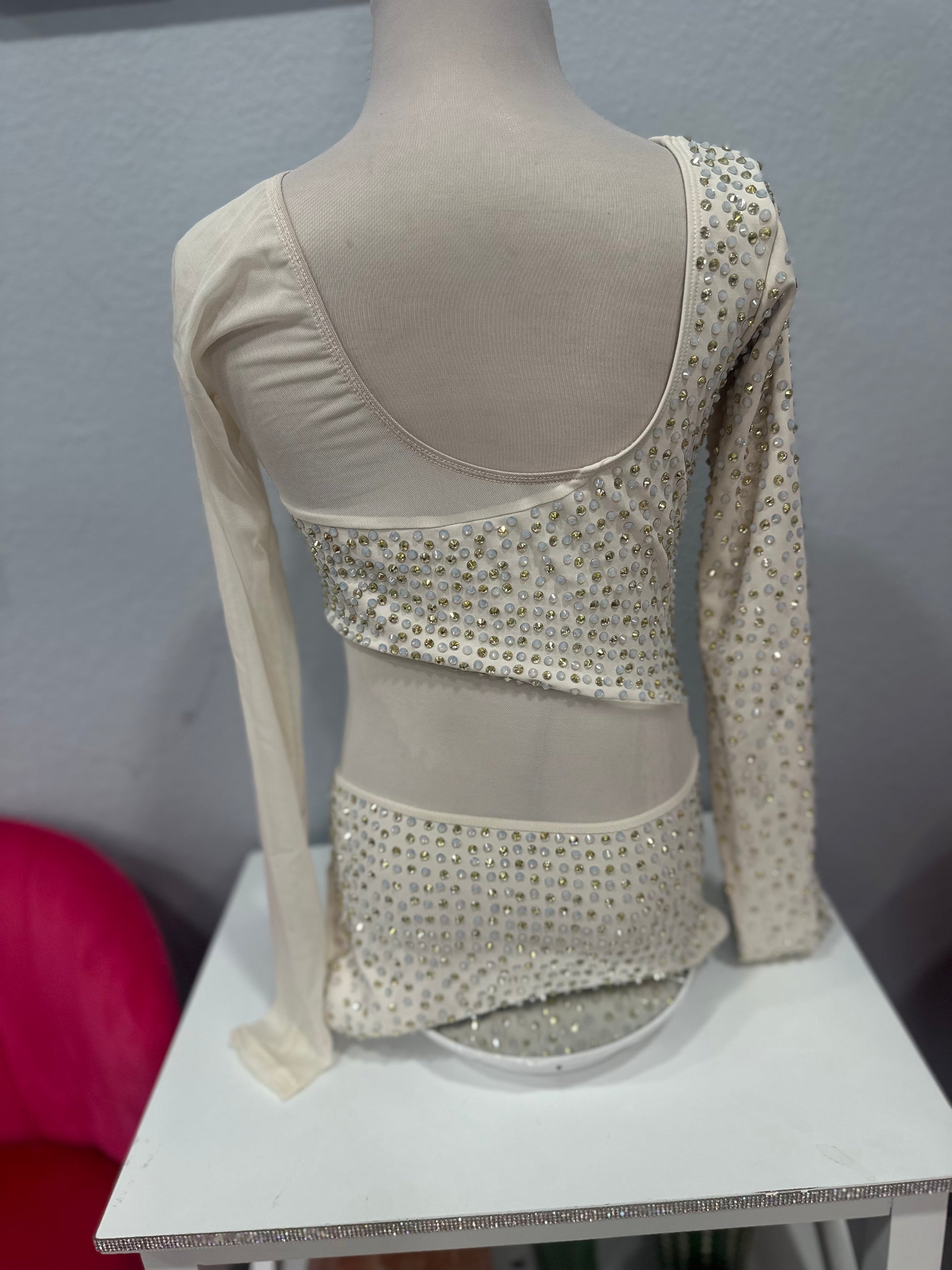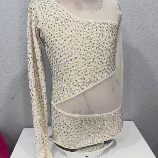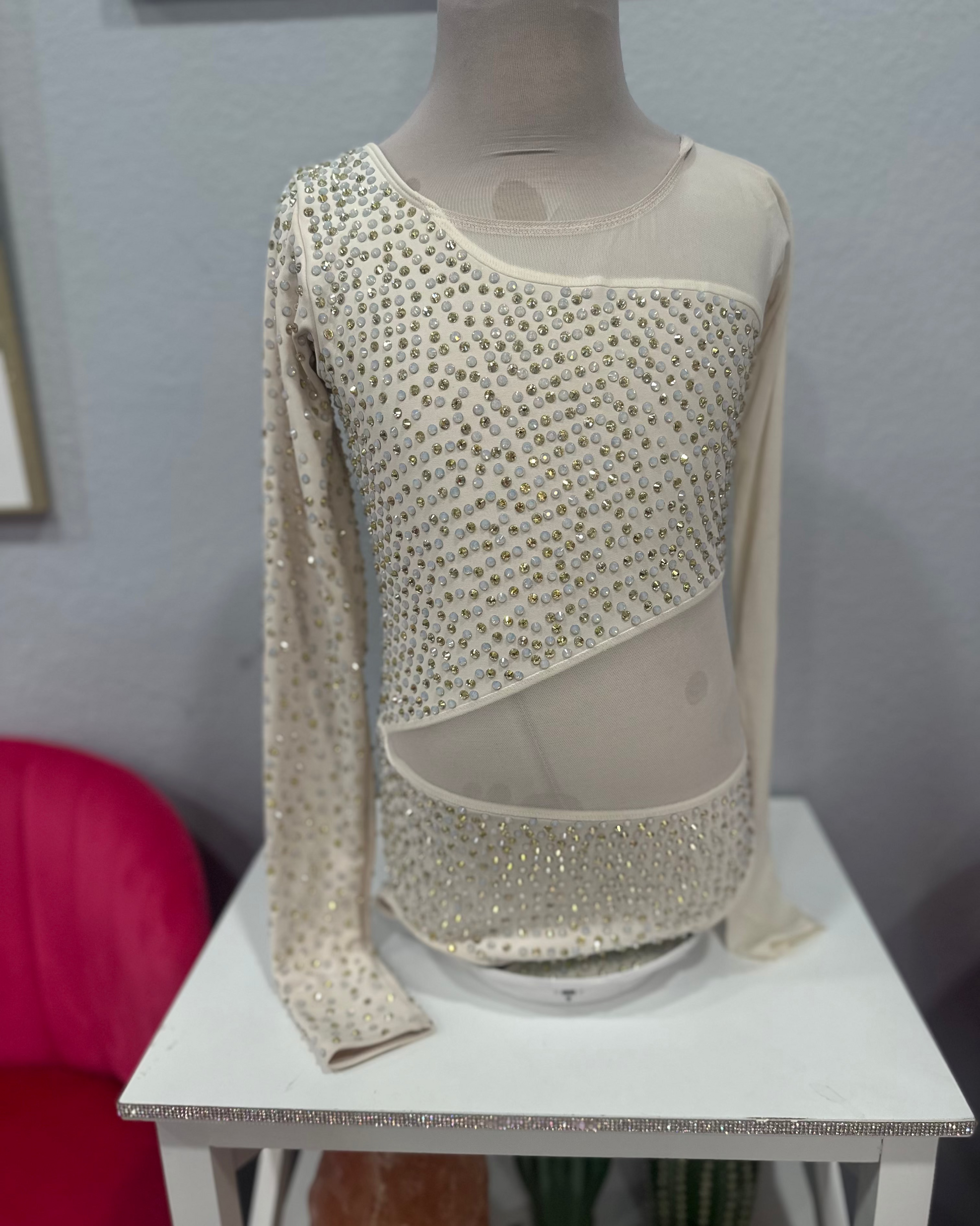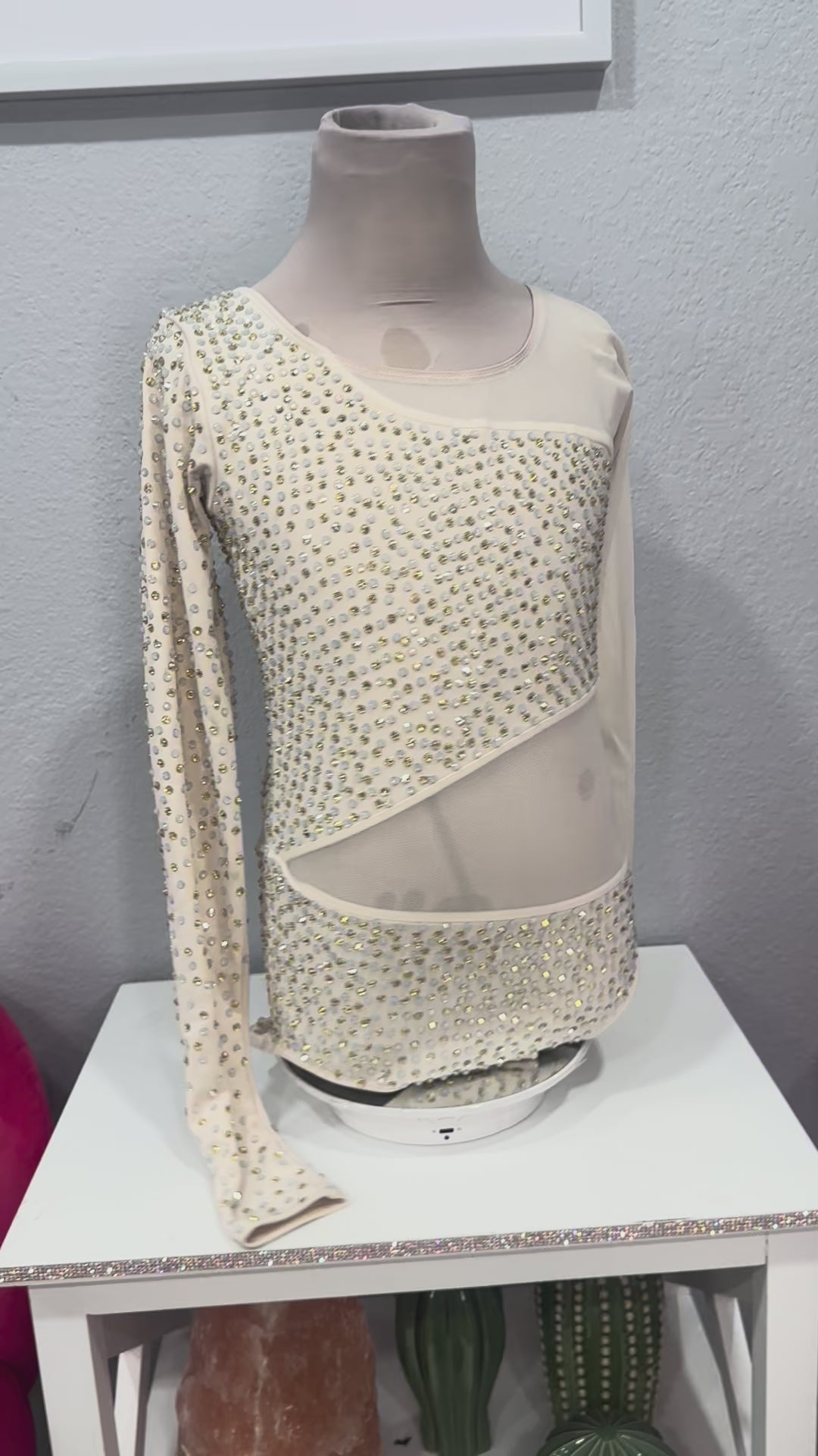 A stunning Eleve base completely covered in 7–10 gross of dazzling Preciosa Maxima stones for unmatched sparkle on stage. This showstopper is available for rent as a solo, duo, or trio, making it perfect for any performance where you want maximum impact and shine.