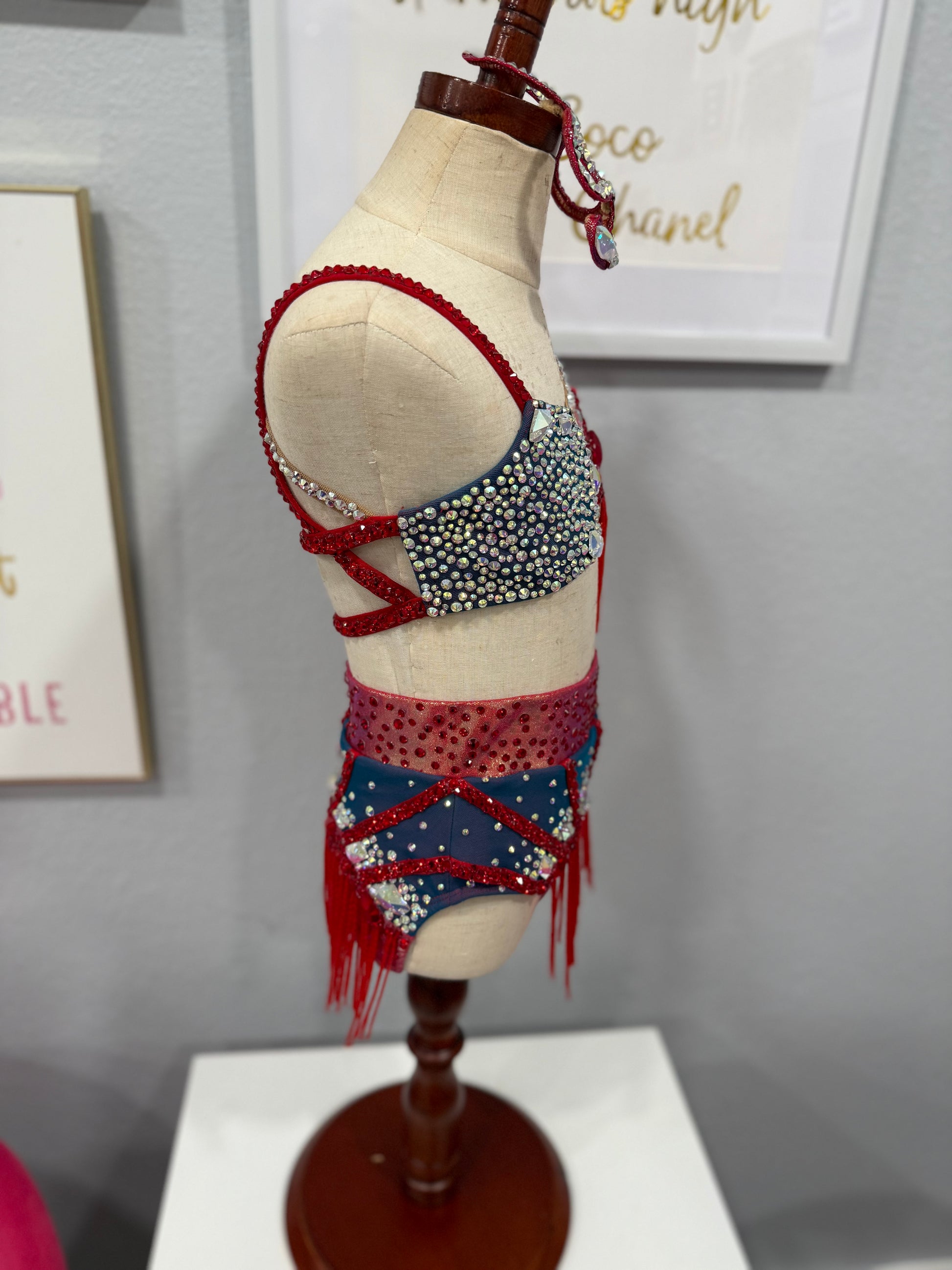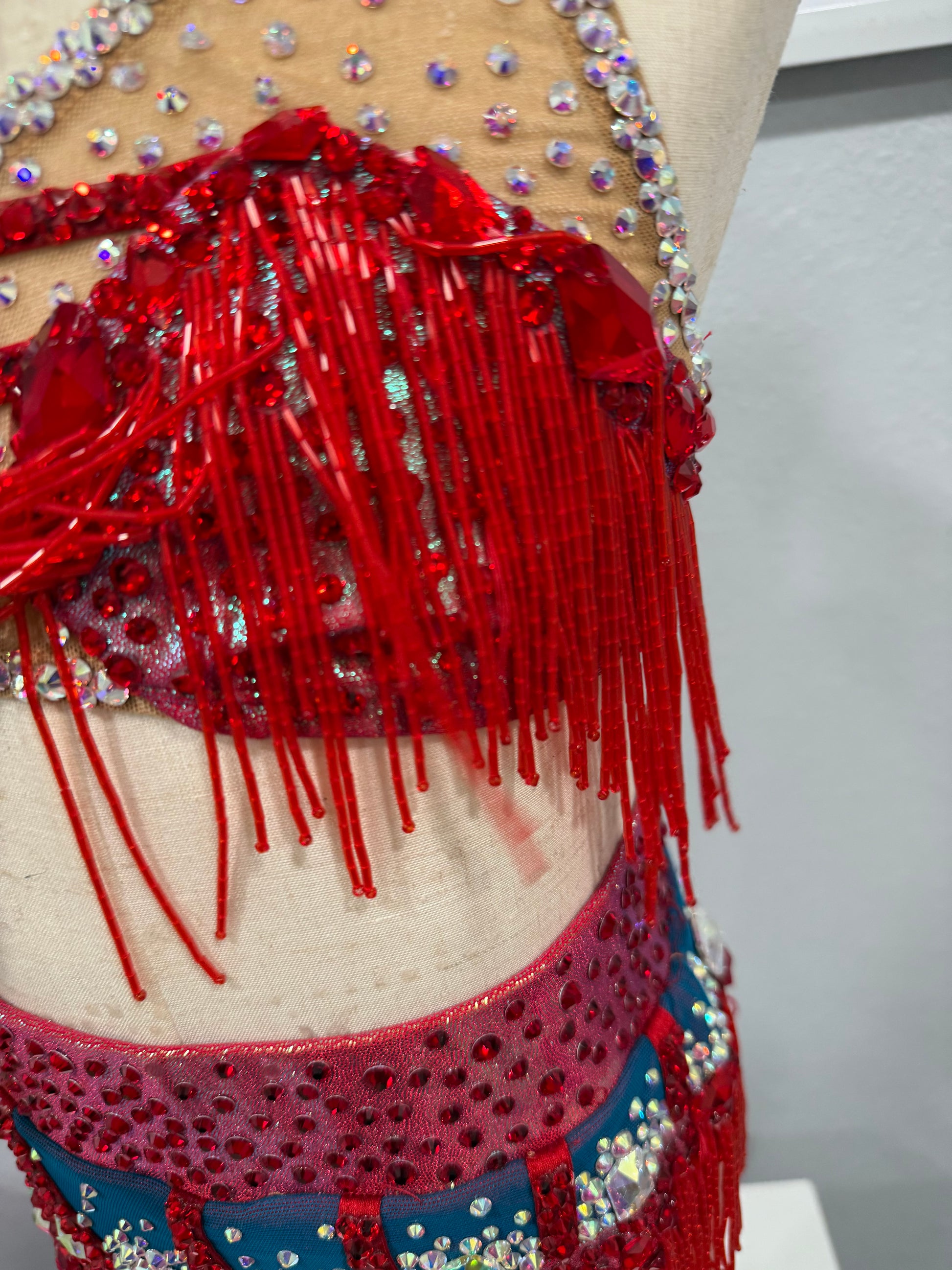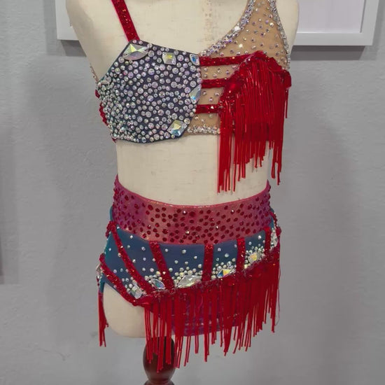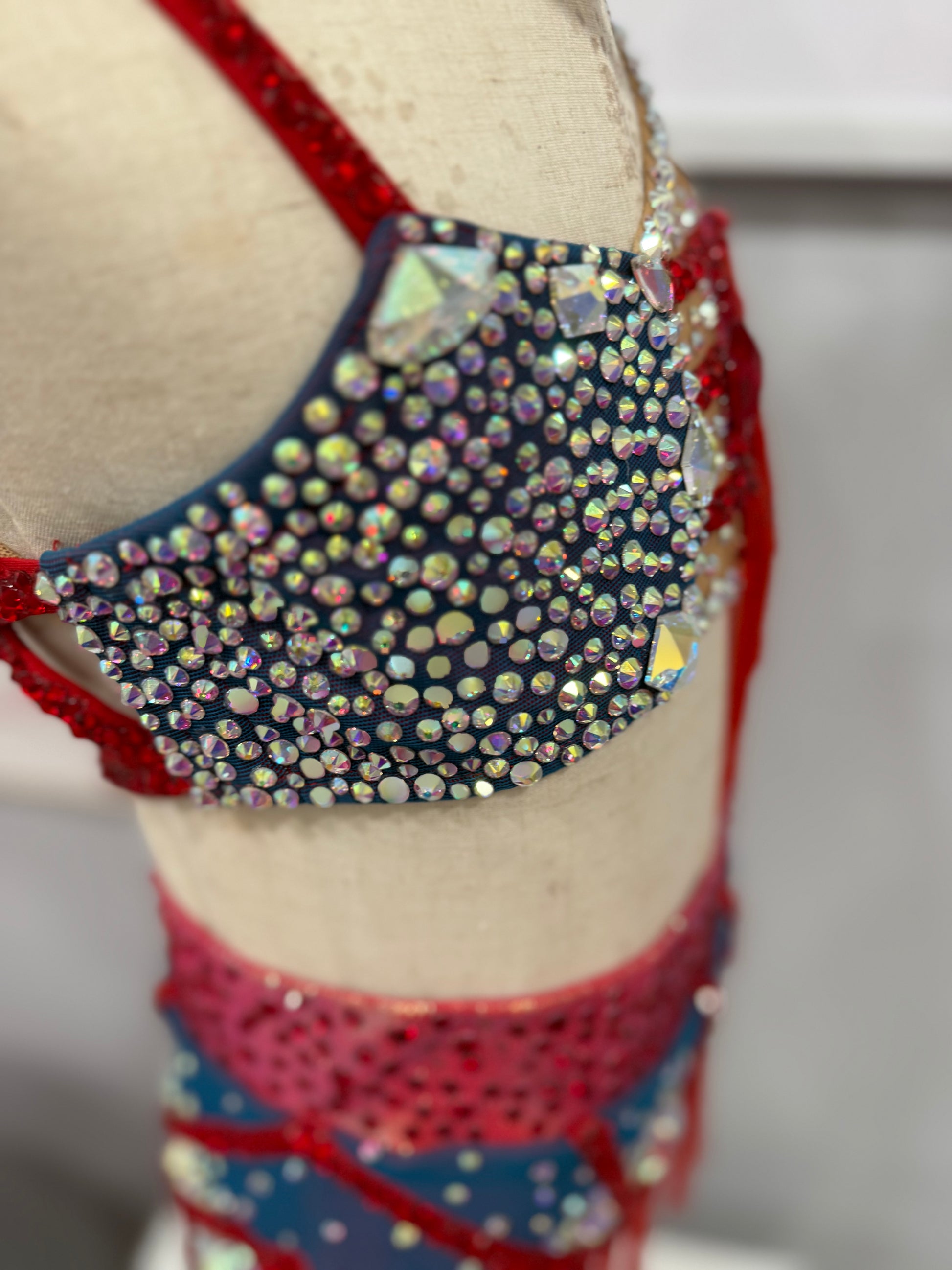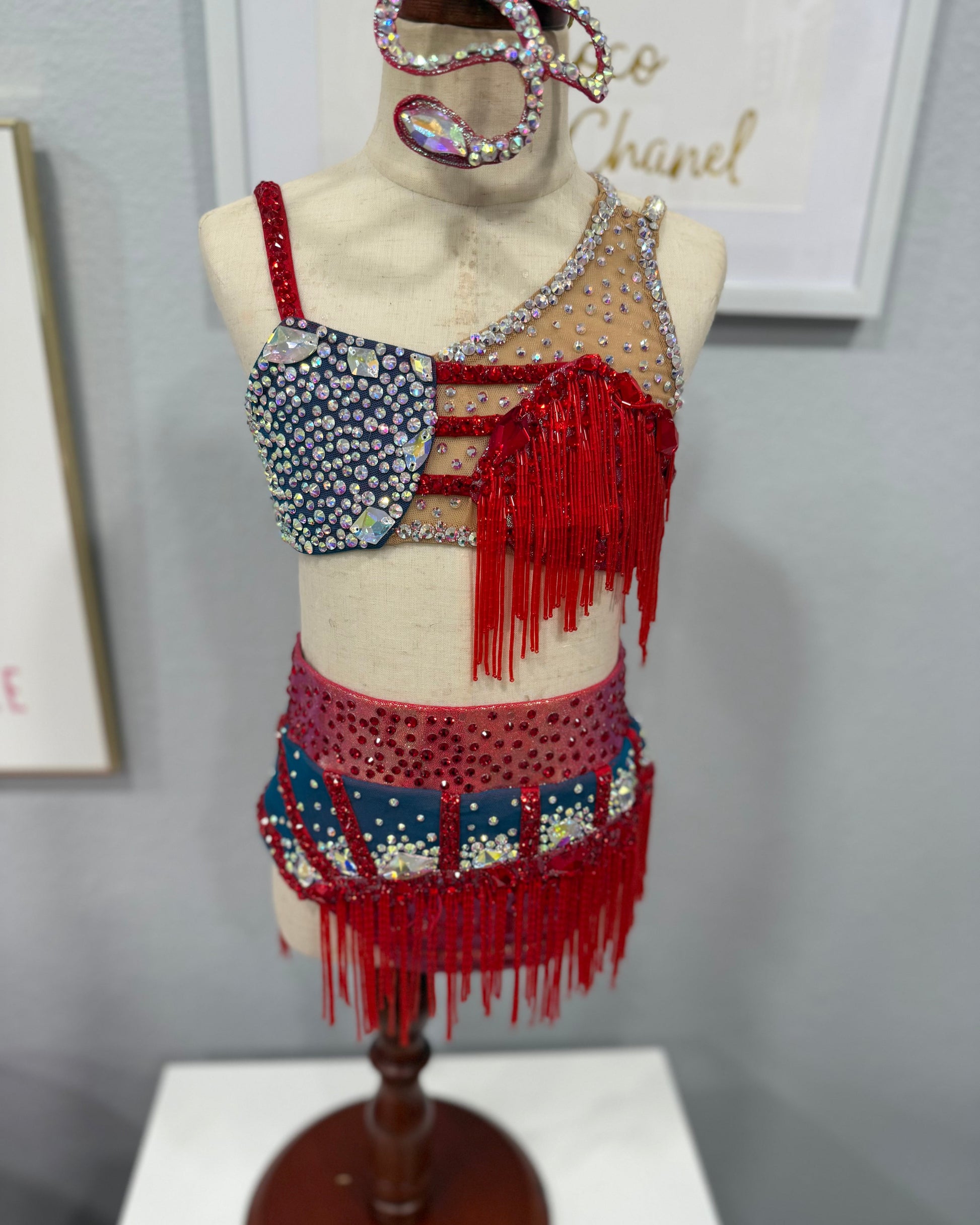 This luxury Boss Couture costume is pure star power. Drenched in dazzling stones, layered fringe, and rich patriotic tones, it brings maximum sparkle and high-fashion flair to every move. Designed to command the stage, this custom look blends precision craftsmanship with bold personality—perfect for the dancer who’s ready to shine.