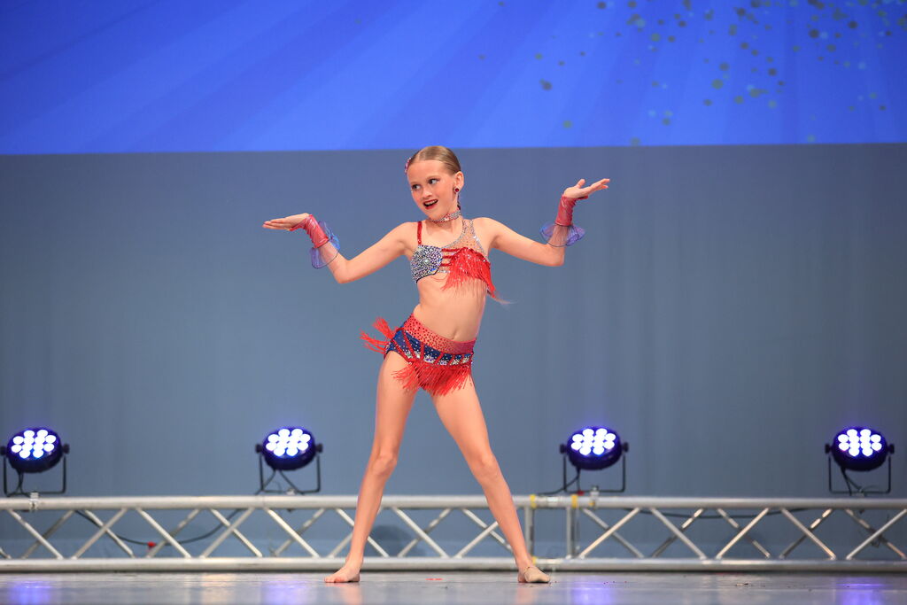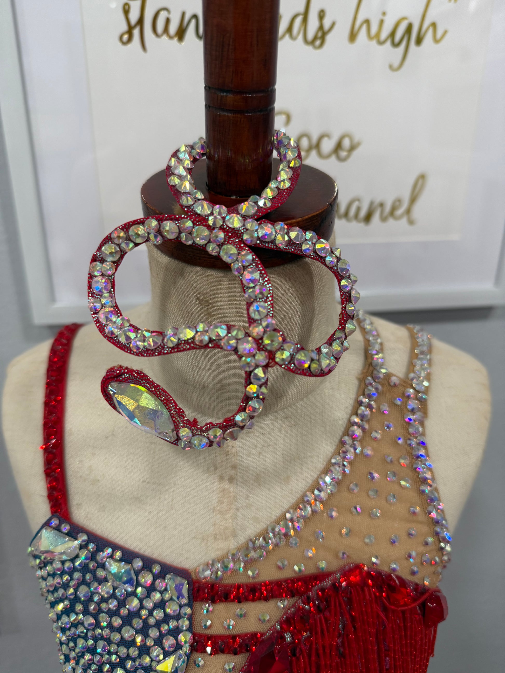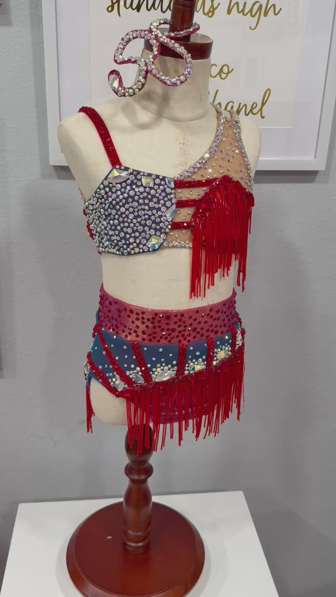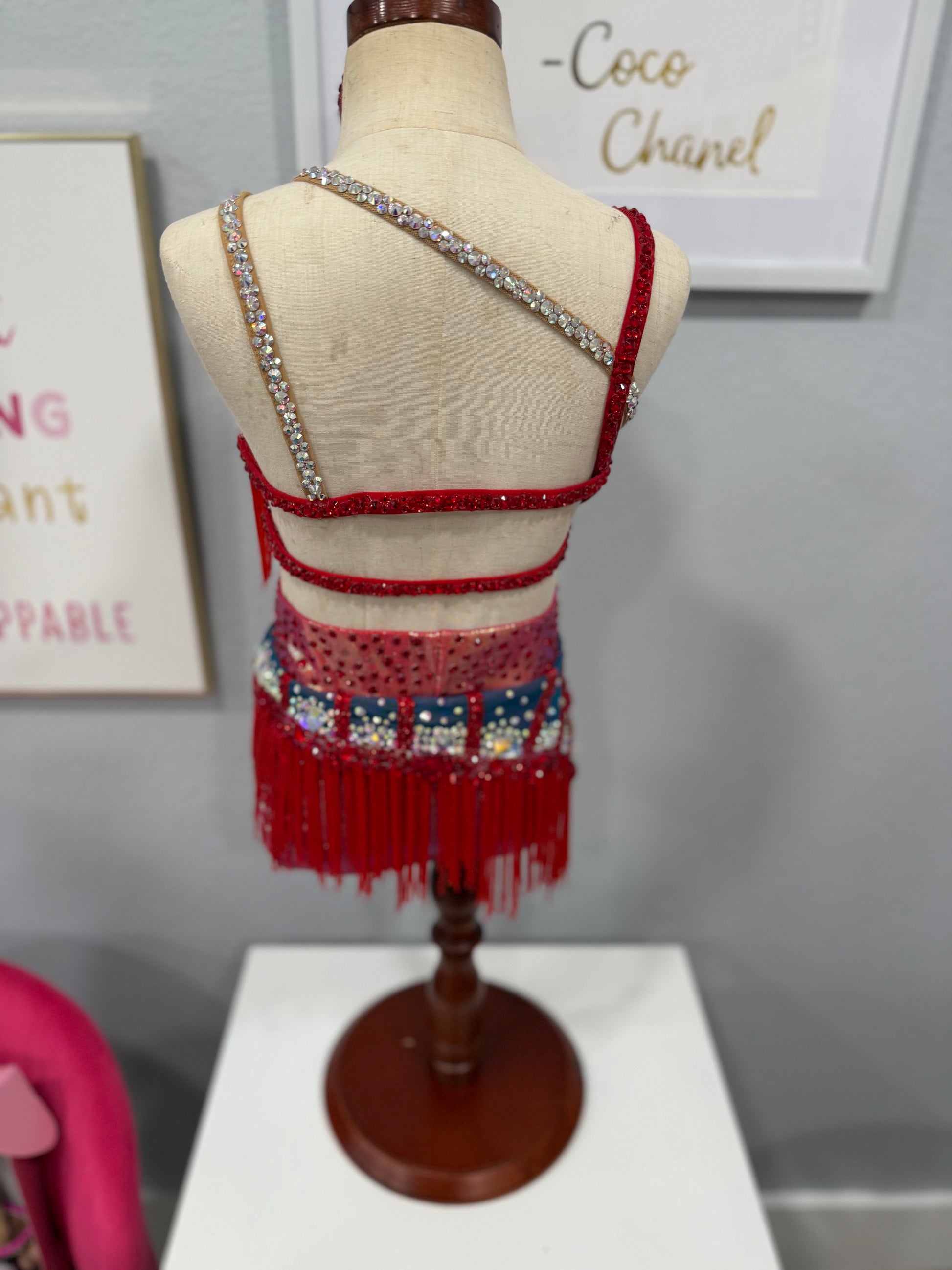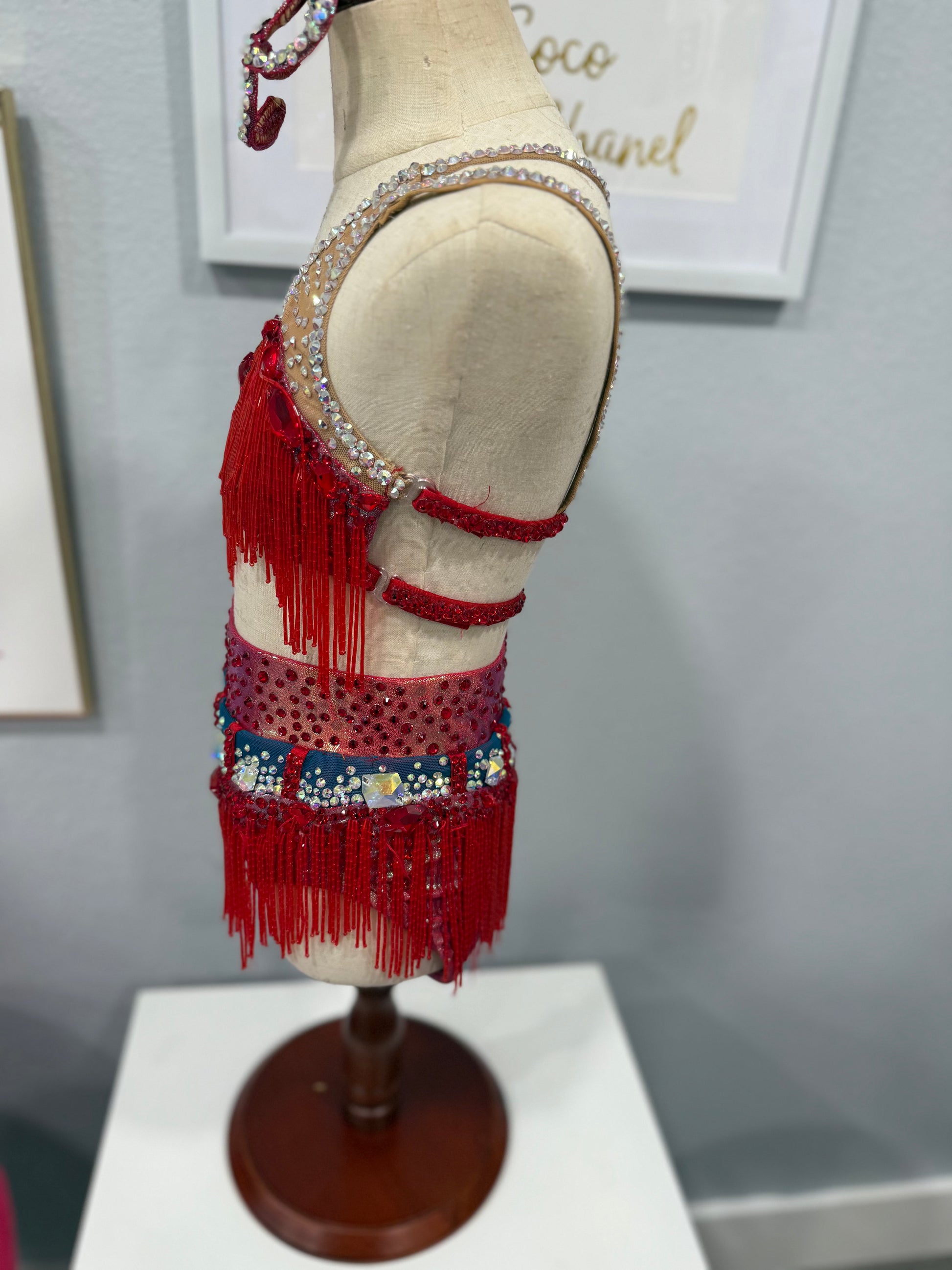 This luxury Boss Couture costume is pure star power. Drenched in dazzling stones, layered fringe, and rich patriotic tones, it brings maximum sparkle and high-fashion flair to every move. Designed to command the stage, this custom look blends precision craftsmanship with bold personality—perfect for the dancer who’s ready to shine.
